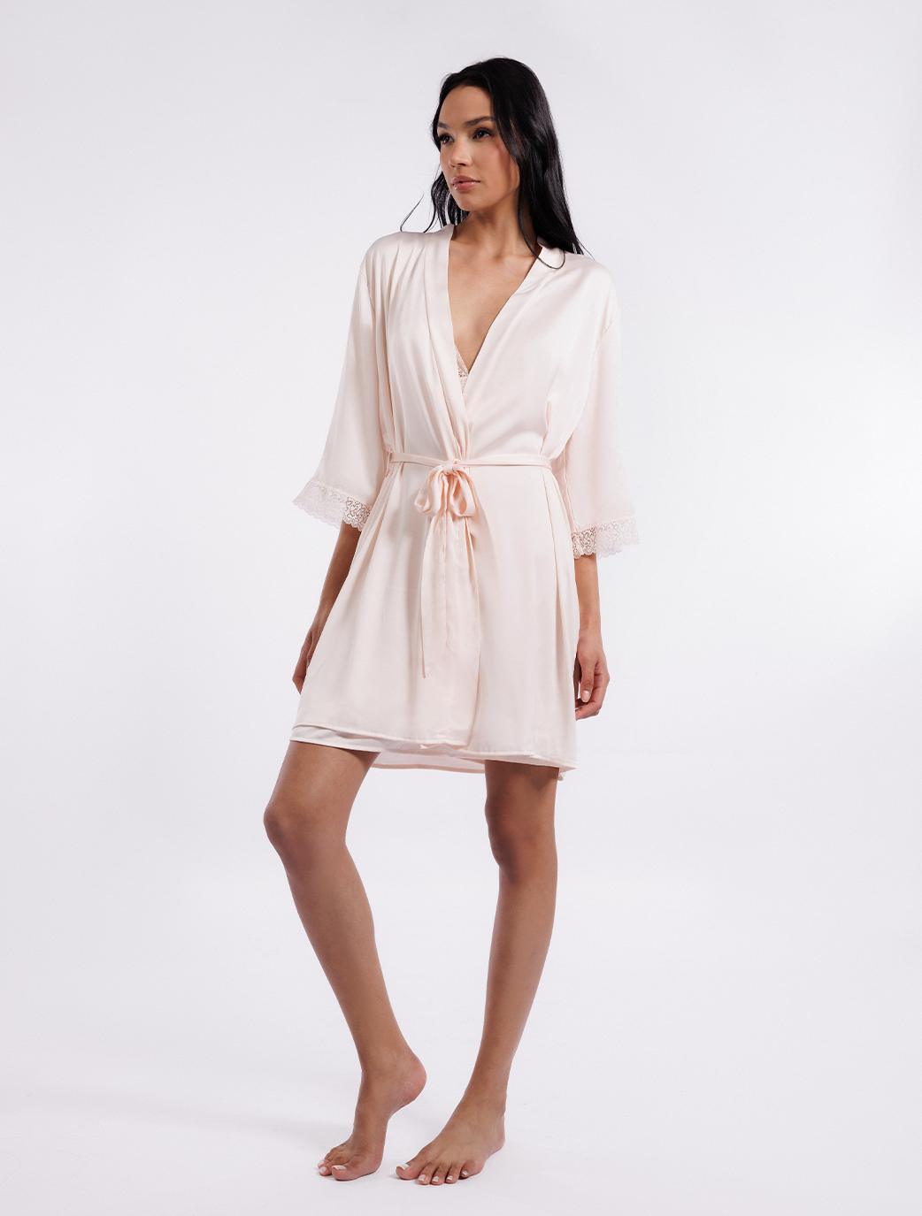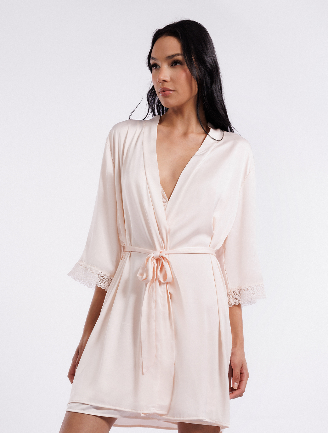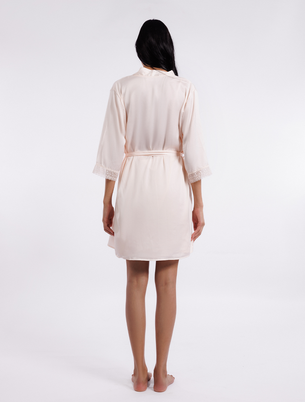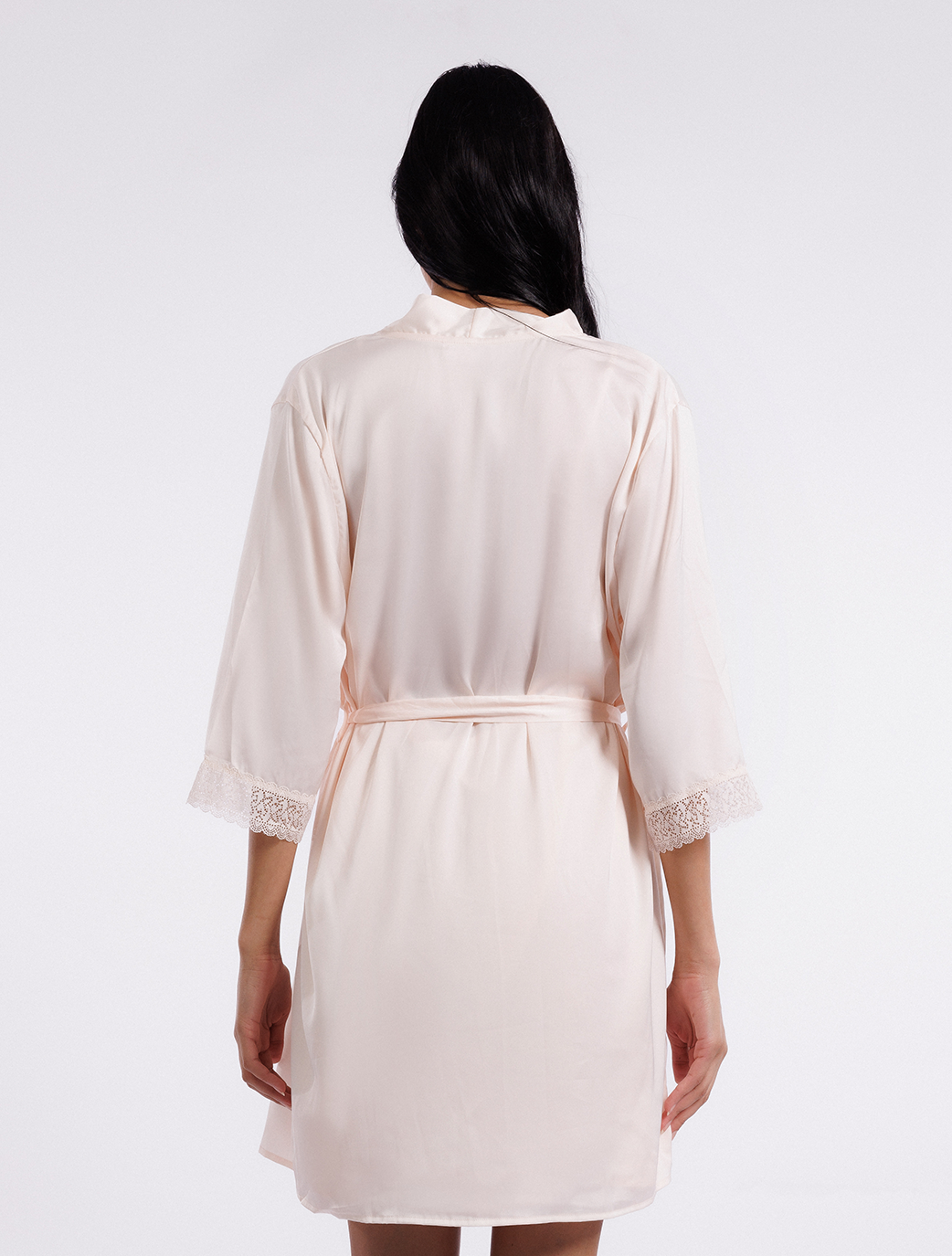 Wrap yourself in luxury as you indulge in the softness of this robe. The intricate lace detailing on the sleeves adds a touch of romance and sophistication.