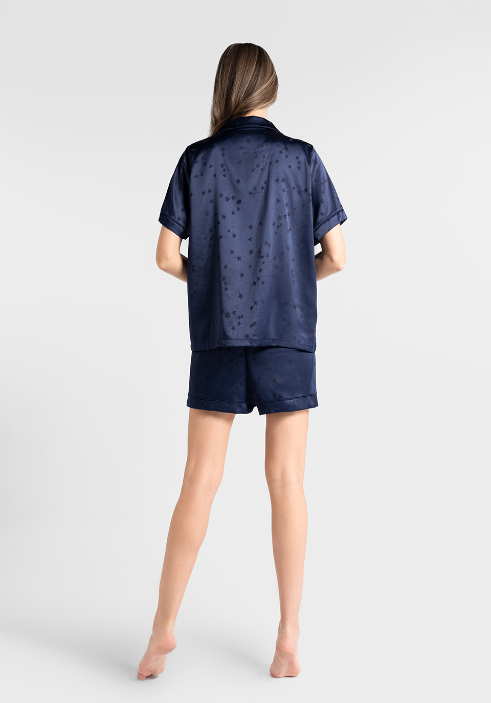 Slip into effortless comfort with these silky Asteroid Shorts, shimmering subtly with a delicate stars jacquard pattern. Perfectly relaxed and breezy, they bring a touch of celestial charm to your loungewear where style meets dreamy softness.