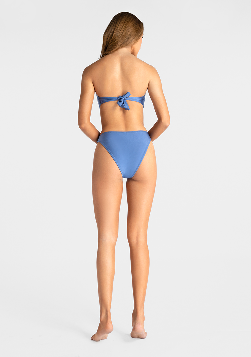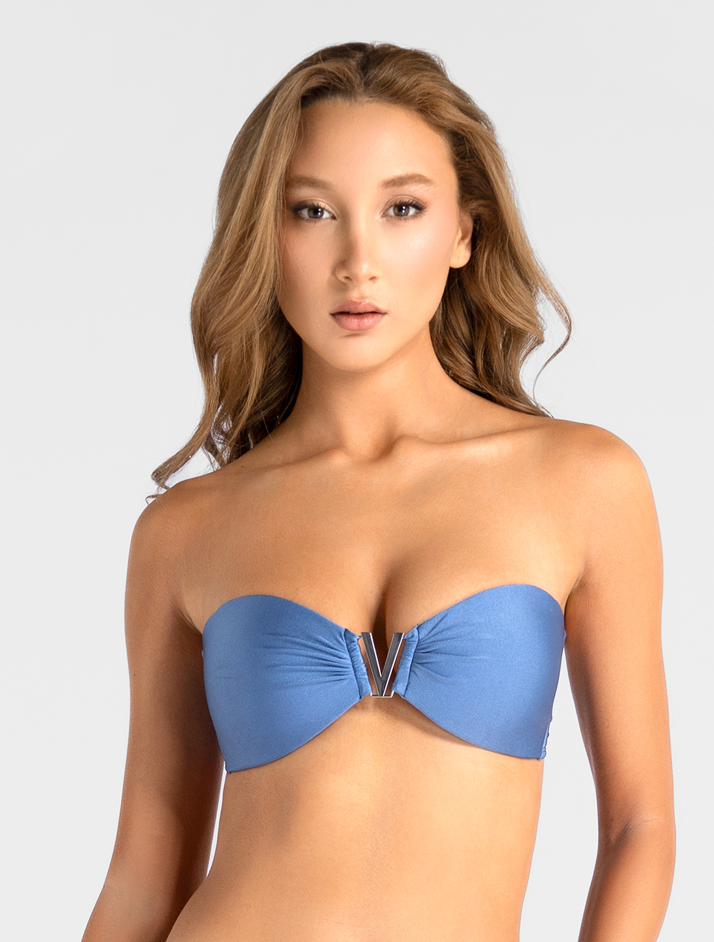 Exuding modern sophistication, this bandeau-style bikini top is rendered in a smooth, shimmering deep blue fabric. It features structured, molded cups with elegant gathering at the center, anchored by a bold, silver-toned V-shaped metallic hardware. The design is finished with thick, supportive ties at the back and a removable halter strap, offering a secure and customizable fit for both lounging and swimming.