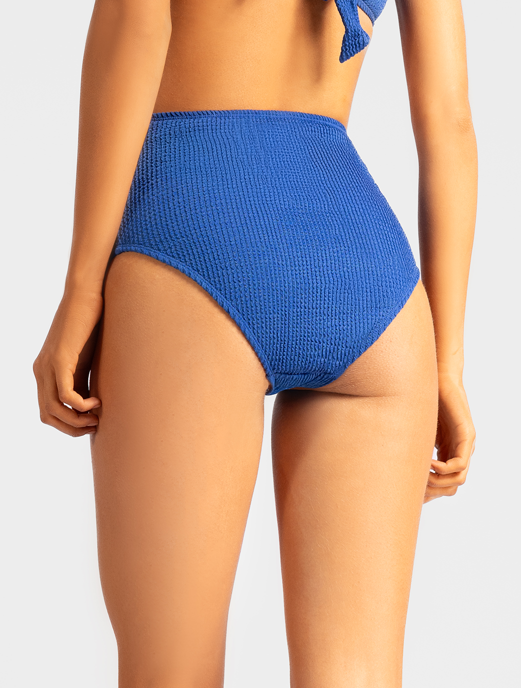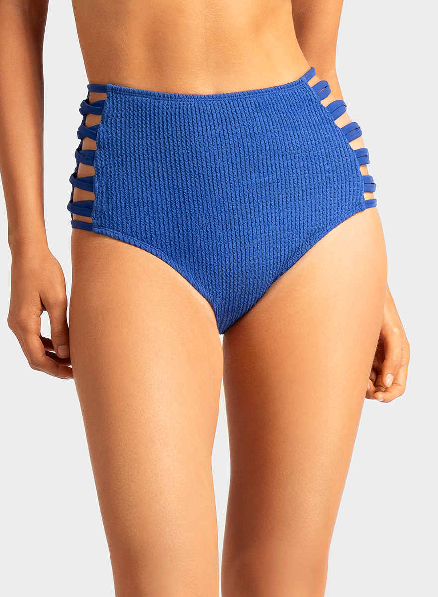 Cheer bikini bottom features a flattering high-waisted design with side straps, offering a guaranteed sexy and bold look. In a vibrant blue color, it combines comfort and style, accentuating your curves for a confident beach-ready vibe.