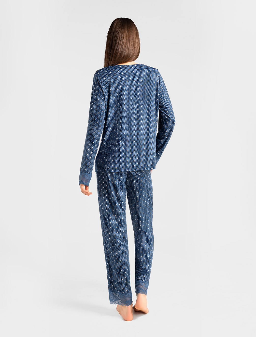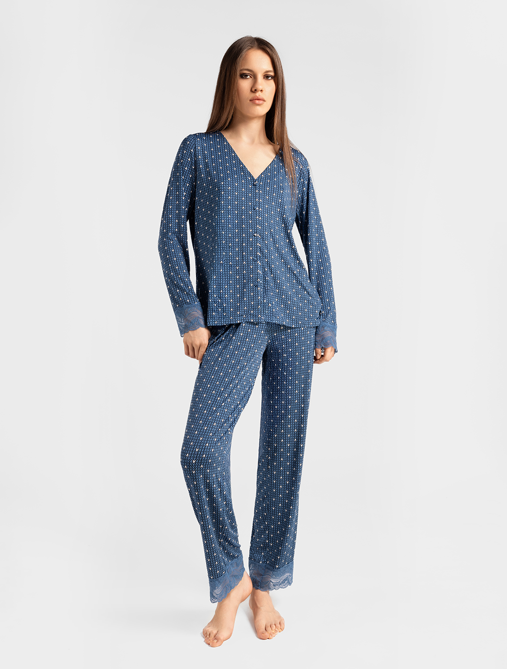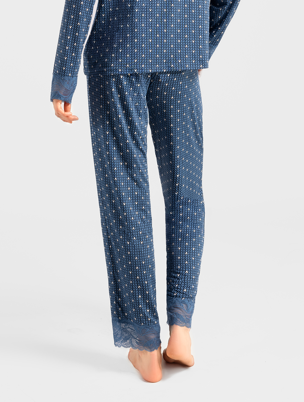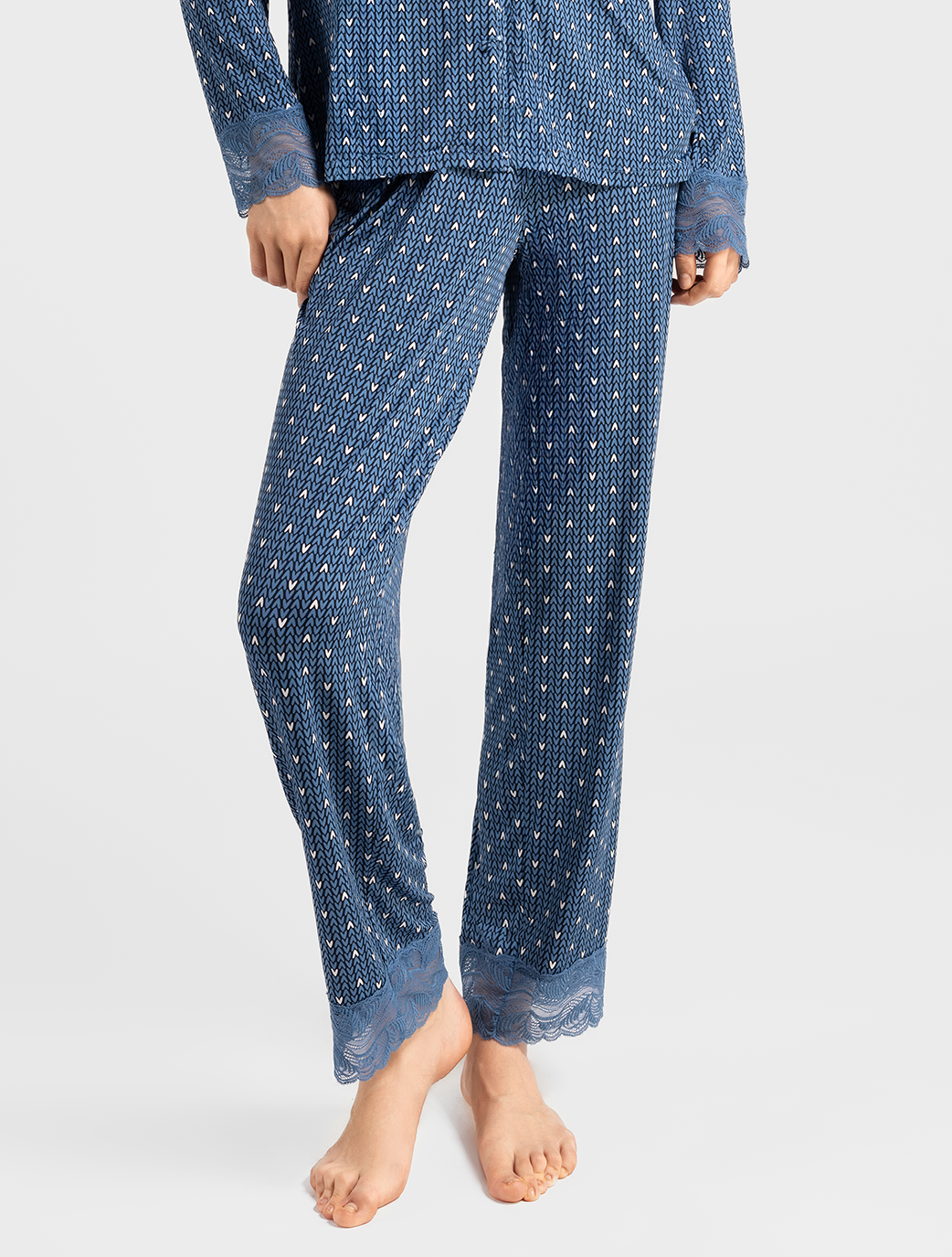 Navy micro satin pajama pants sprinkled with mini pink hearts, combining comfort and charming style for a perfect night’s sleep.