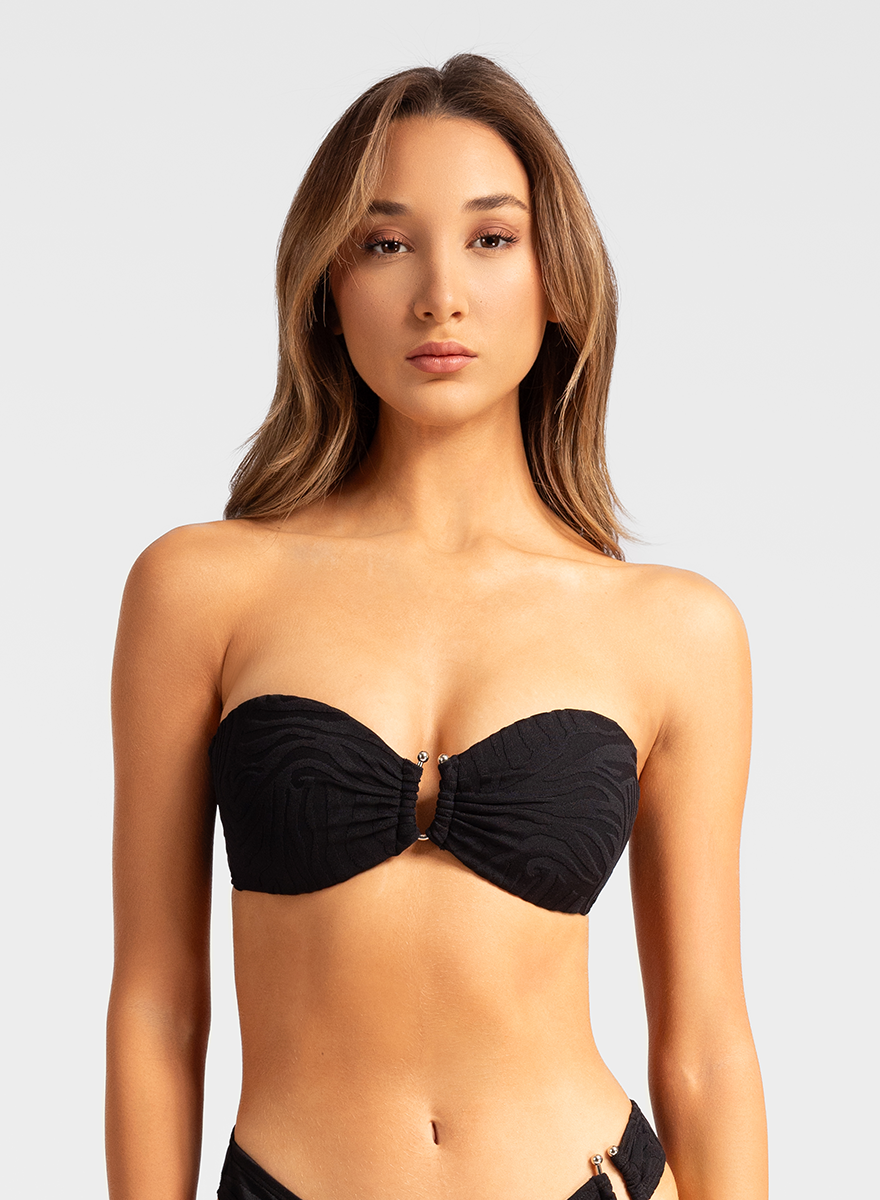 This sexy front bikini top, designed with a metal ornament in the center, offers great support and enhances your shape.