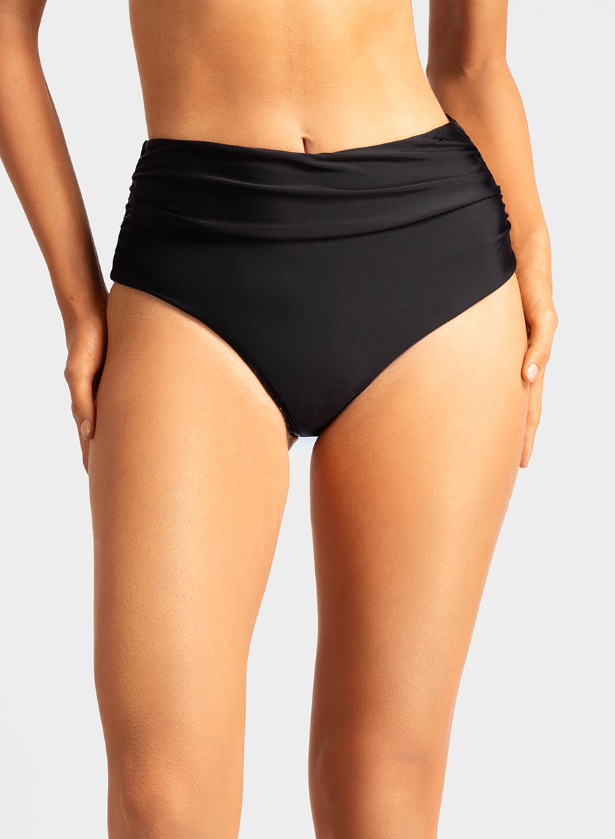 Coco Bikini Bottom in black features a high-waist design that offers extra coverage while creating a flattering, retro-inspired silhouette. Its elevated waistline enhances the figure, providing a comfortable and stylish fit for any swim outing. The classic black color adds a timeless touch, making it easy to pair with various bikini tops.