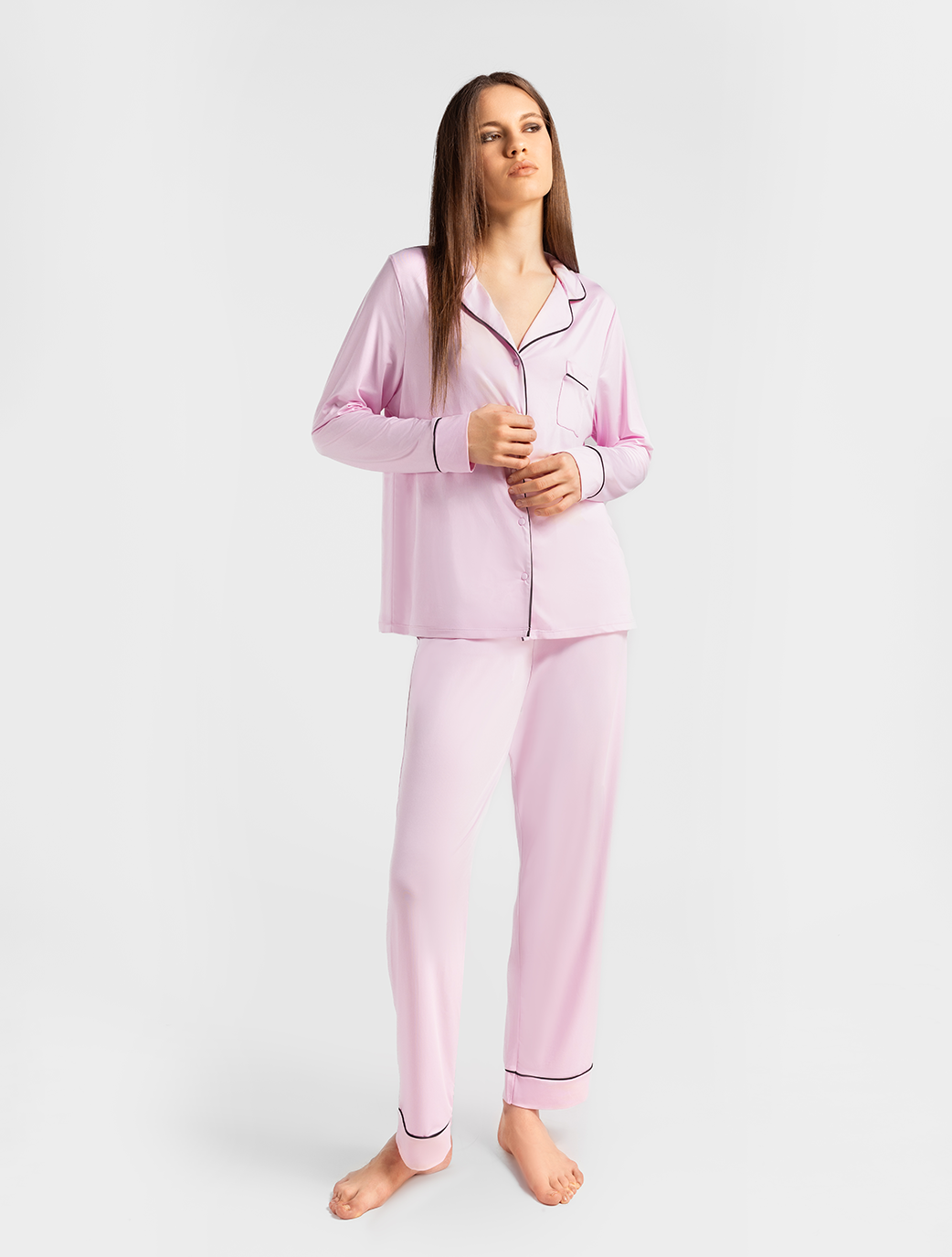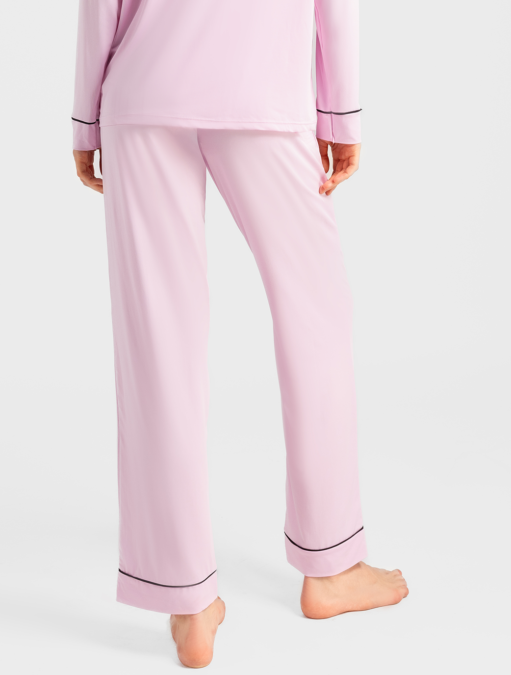 Delicate pink micro satin pants that blend cozy comfort with a touch of luxe, perfect for stylish relaxation.
