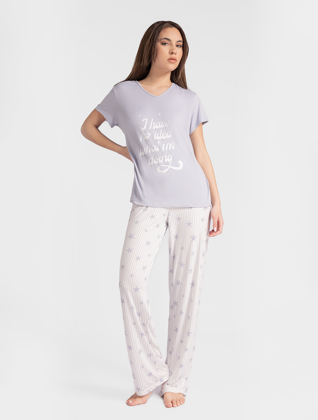 Gotaya T-Shirt is a fun and relaxed blue nightwear piece, featuring the playful phrase I have no idea what I'm doing in a bold, quirky print. With its classic round neck design, this shirt offers both comfort and humor, making it the perfect choice for a laid-back and cozy night of sleep or lounging.