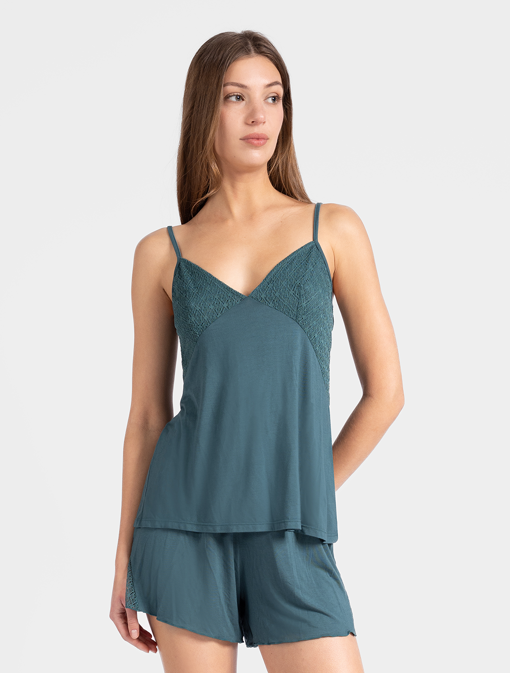 Embrace a luxurious late-night routine with the Kania pajama top in a rich deep kaki color. Featuring a flattering plunging neckline and a striking open back with intricate lace detailing, this top combine elegance and sensuality.