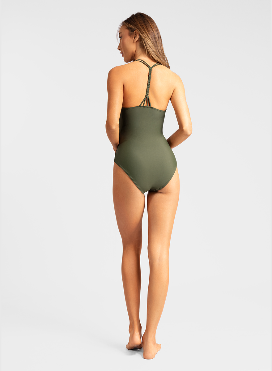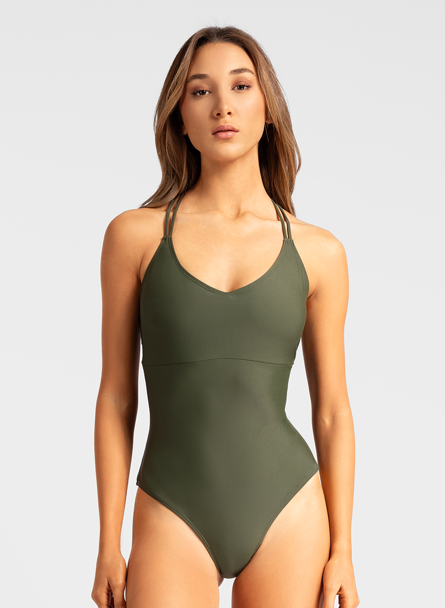Lunar One-Piece Swimsuit in army green features a vibrant and playful design with double straps, adding a bold contrast to the earthy tone. Made from smooth, stretchy recycled fabric, it ensures a comfortable and flattering fit, perfect for both lounging and active beach days.