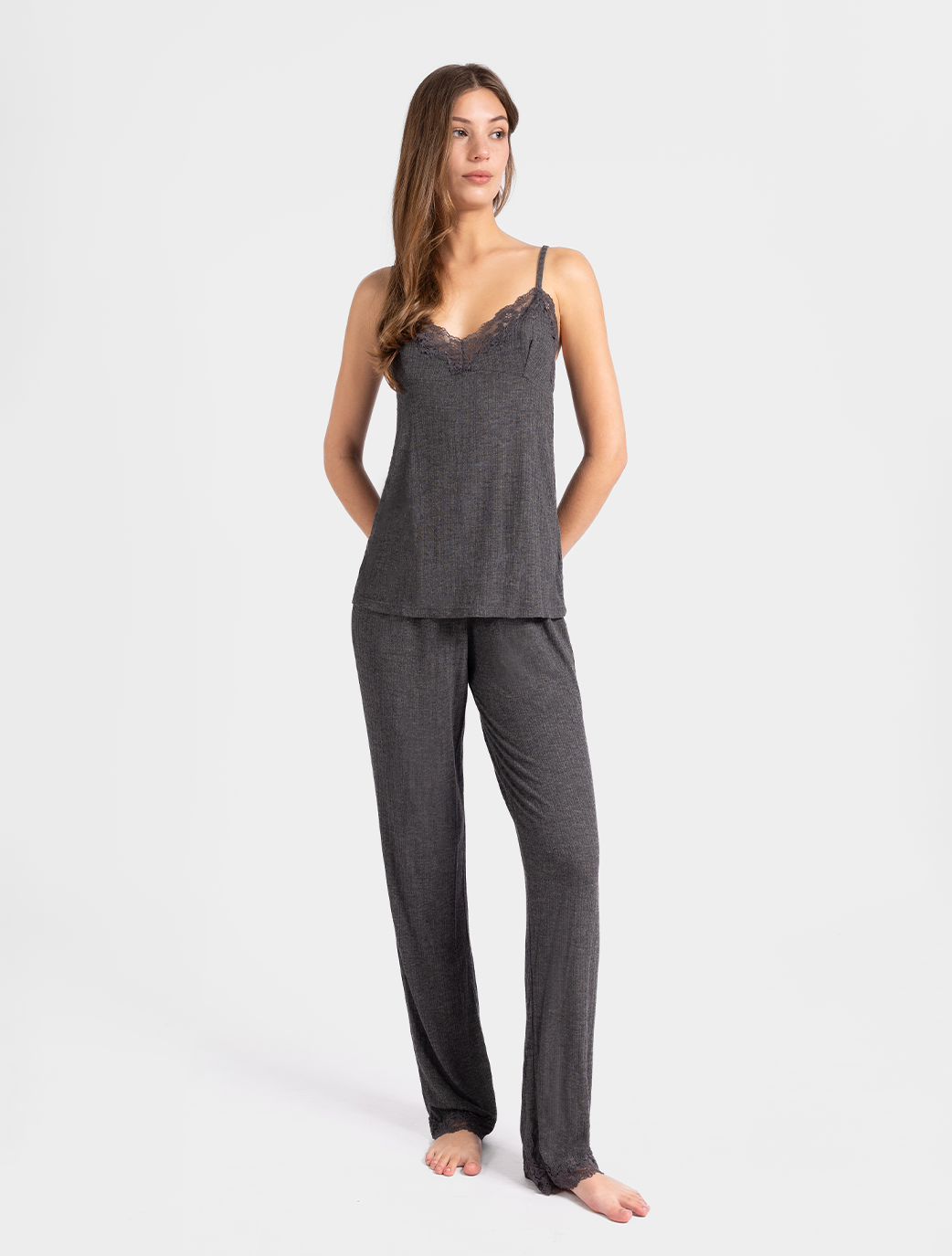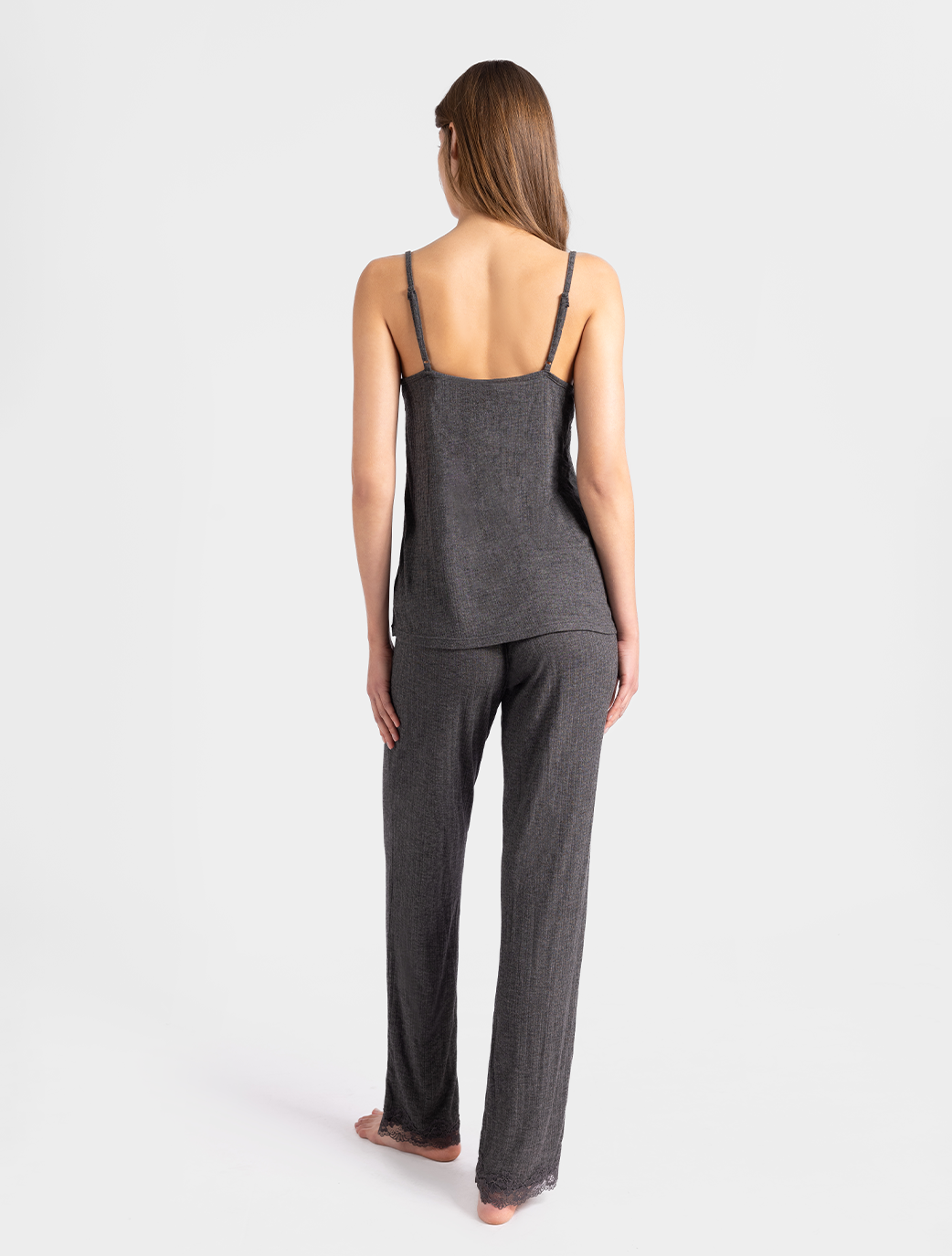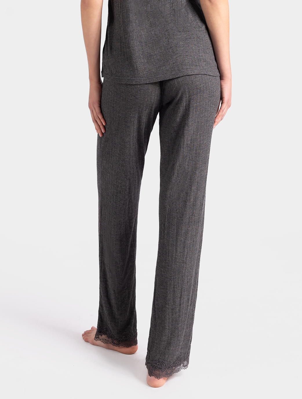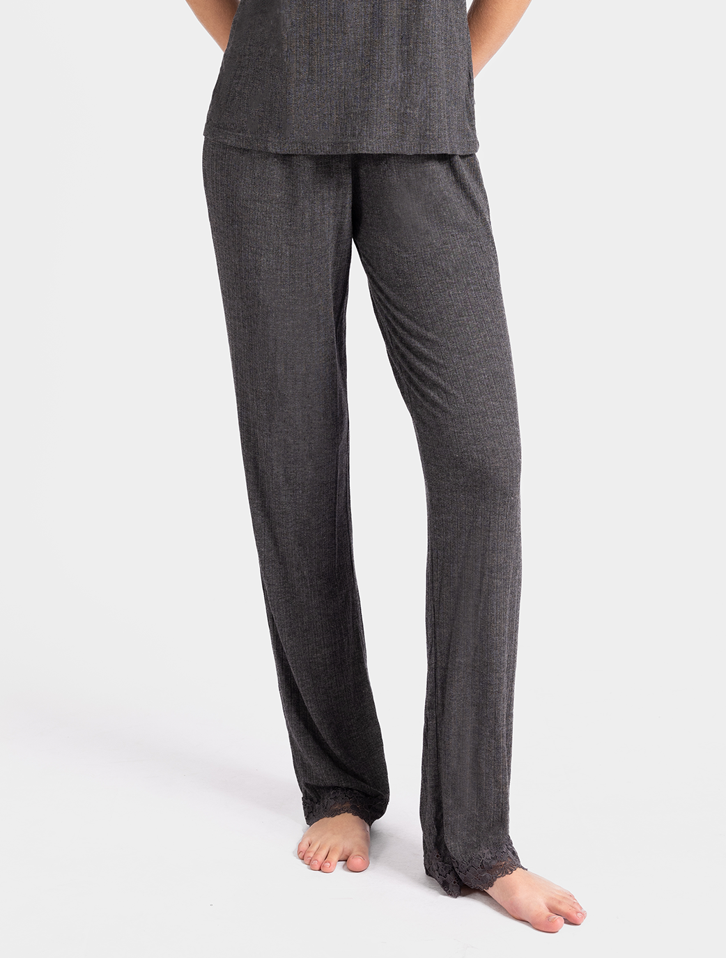 Mereka pajama pants in dark grey offer a perfect blend of comfort and style. Crafted from soft, breathable fabric, they feature a relaxed fit with a subtle ribbed texture for added elegance. The delicate lace detail at the waistband adds a touch of femininity, making these pants a chic and cozy choice for lounging or a peaceful night’s sleep.