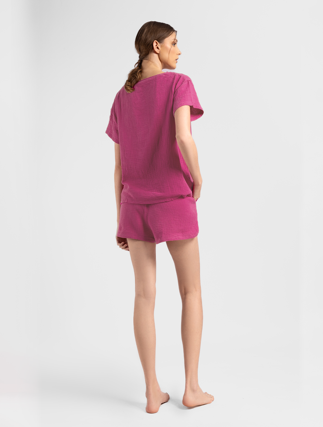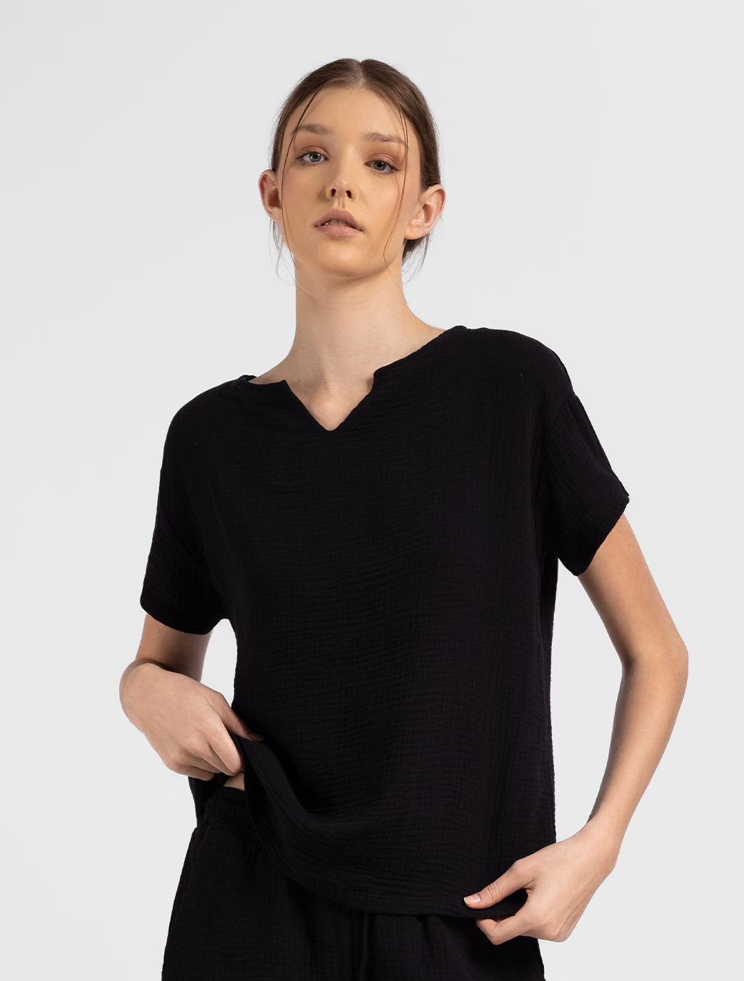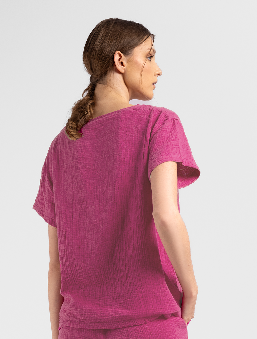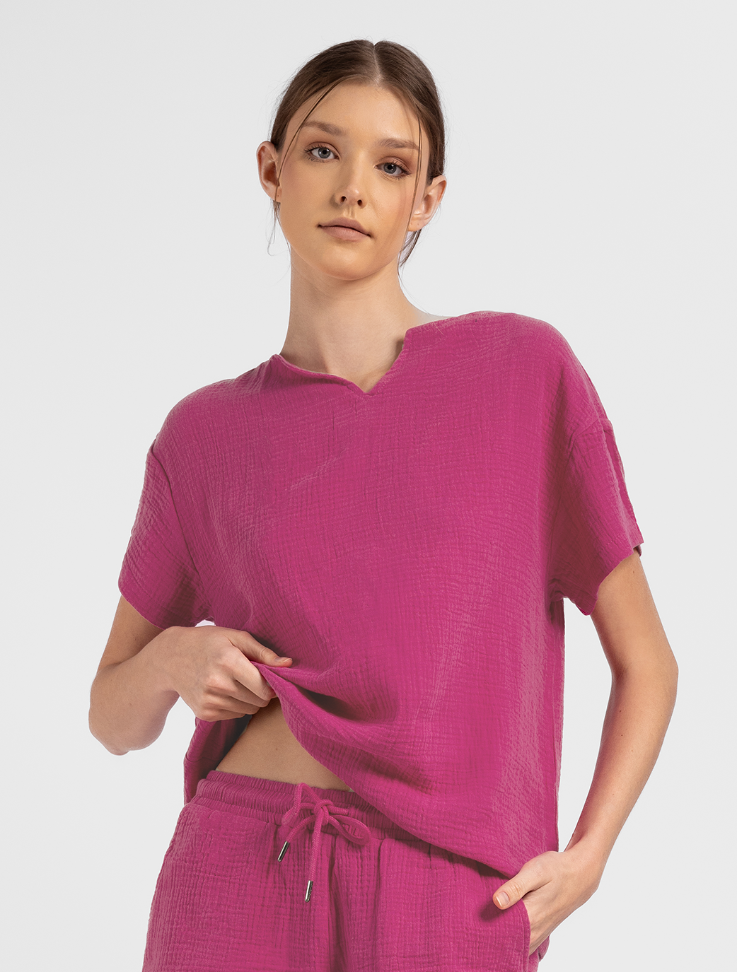 Mirima Top is a stylish and comfy loungewear piece available in two colors: Fushia and black. It features a simple cut-out neckline for a modern look, making it perfect for lounging at home or as a beach cover-up.