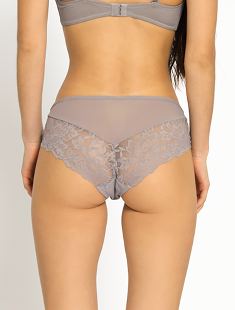 An intricately embroidered pattern romances tanga mesh briefs cut.