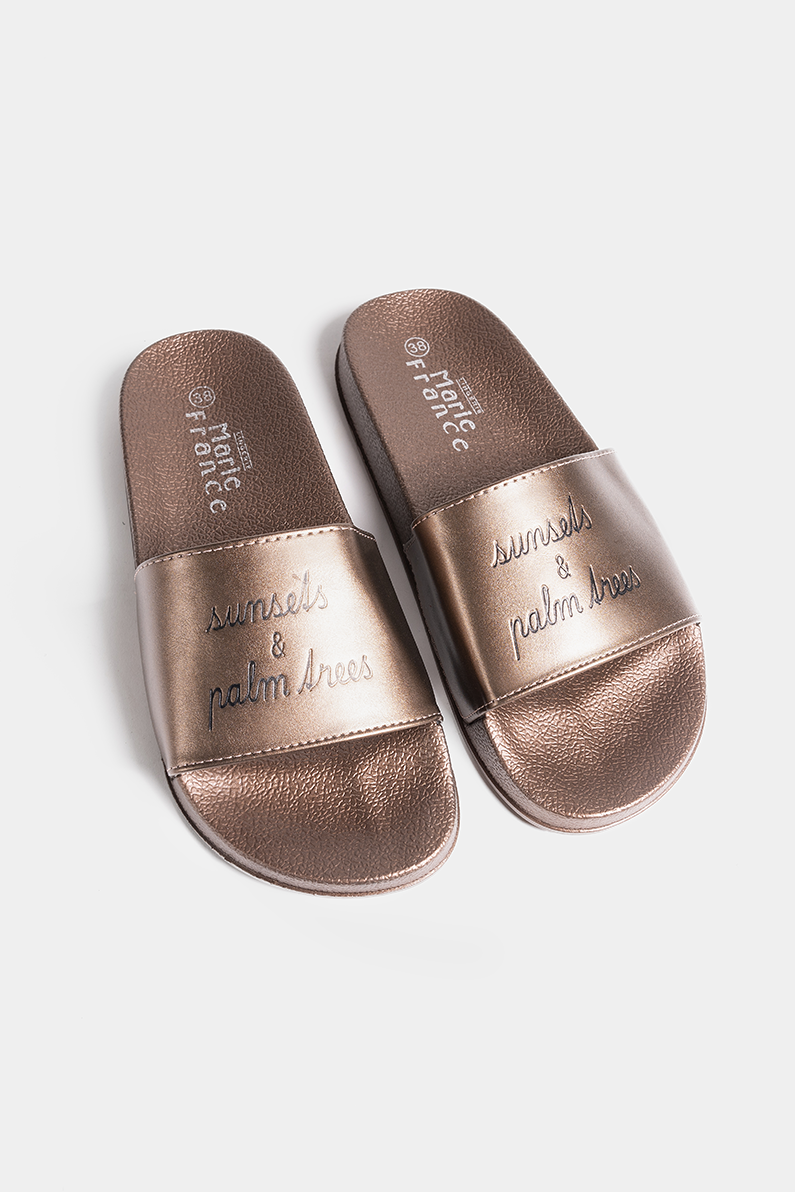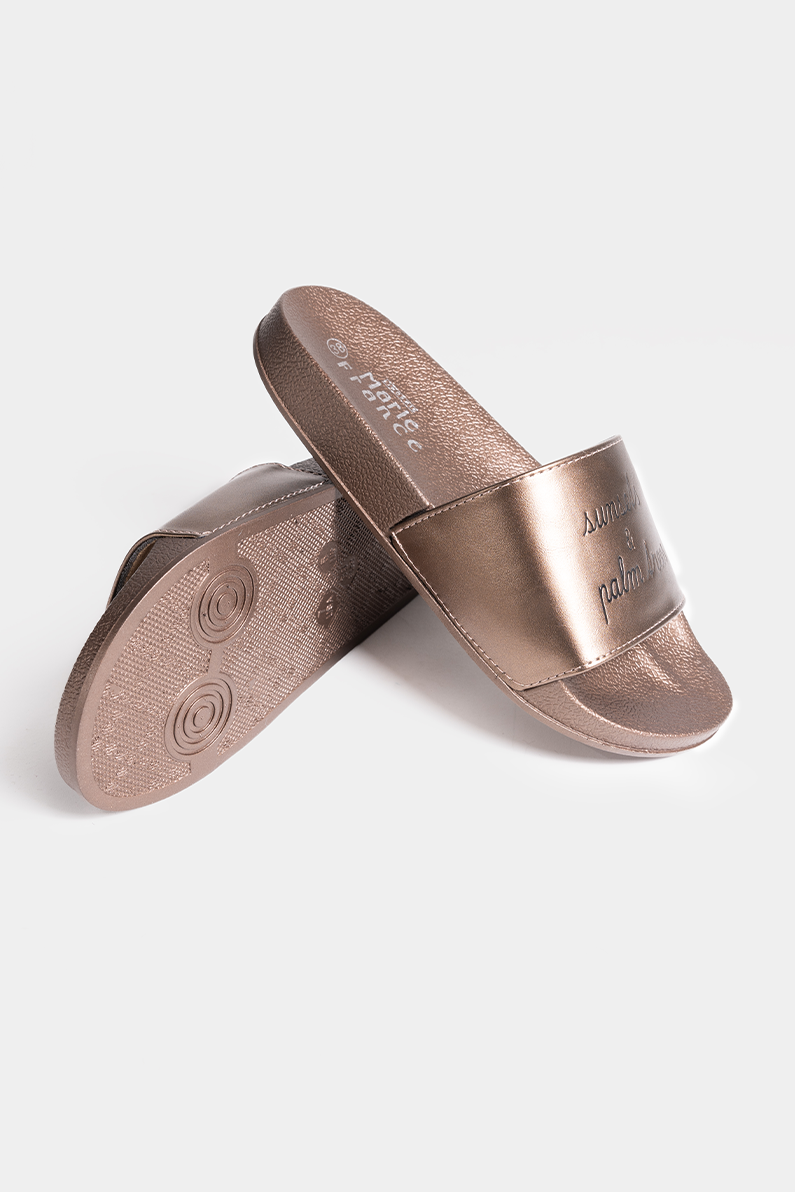 Step into effortless elegance with our Palmy Slider in a stunning bronze color. Featuring a sleek, shiny finish, this slide combines style and comfort, making it the perfect addition to your summer wardrobe for beach days, casual outings, or poolside relaxation.