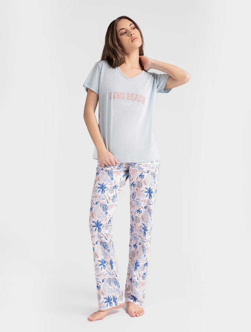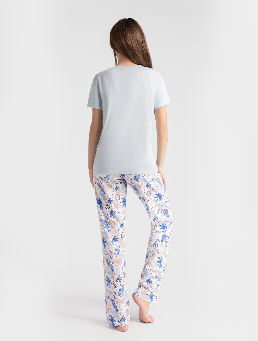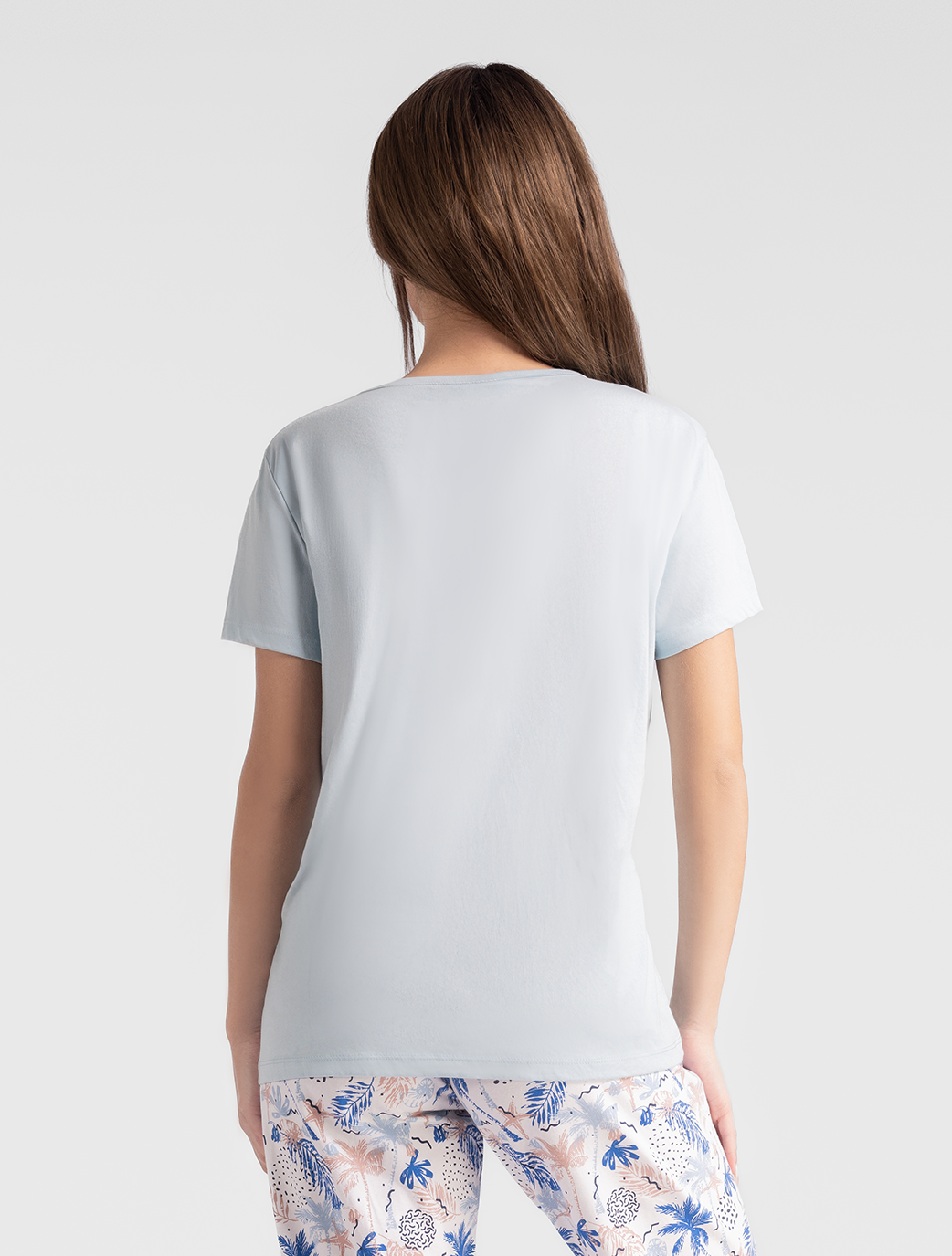 With a round neckline and rolled-up short sleeves, this pajama t-shirt comes in a light blue color that perfectly complements the beachy tropical vibes of the matching pants or shorts.