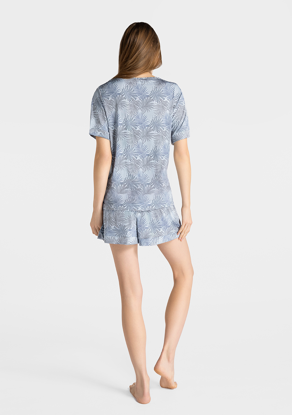 These sleep shorts are crafted from a soft, solid blue material for a consistent and comfortable feel. They feature a gathered elastic waistband that sits comfortably on the hips without restriction. The wide, airy leg openings provide a breezy silhouette, making them an ideal choice for warmer nights while maintaining a simple, clean aesthetic.