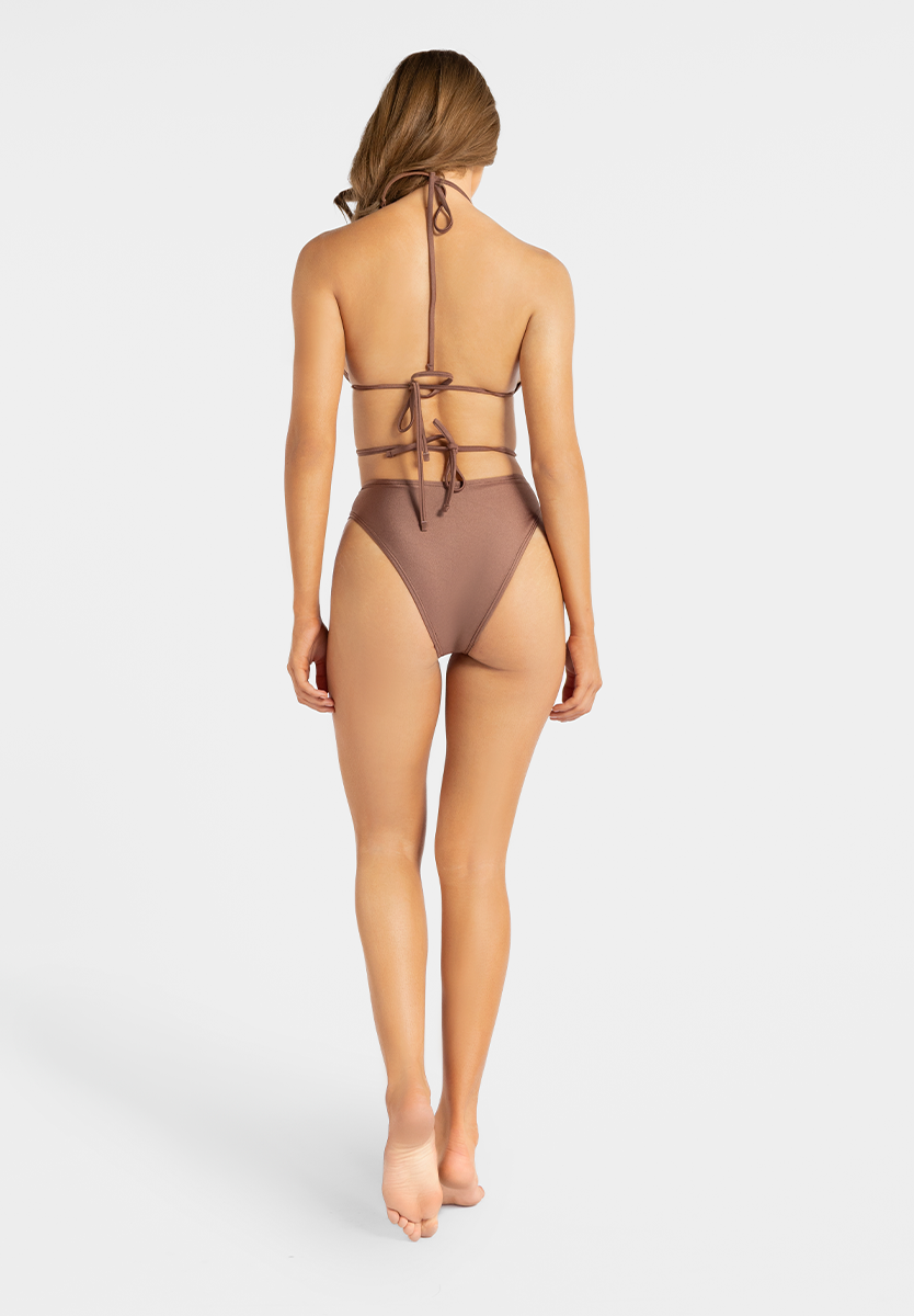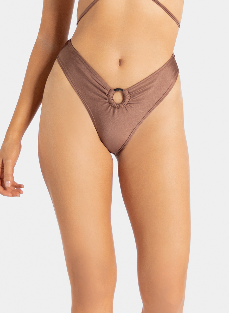 Elevate your beach look with these vintage-inspired high-waisted bottoms in a matching bronze metallic finish. These bottoms are designed to flatter the natural waistline while offering a modern, hardware-centric detail. Made from high-quality, stretch fabric with a smooth, luminous finish.