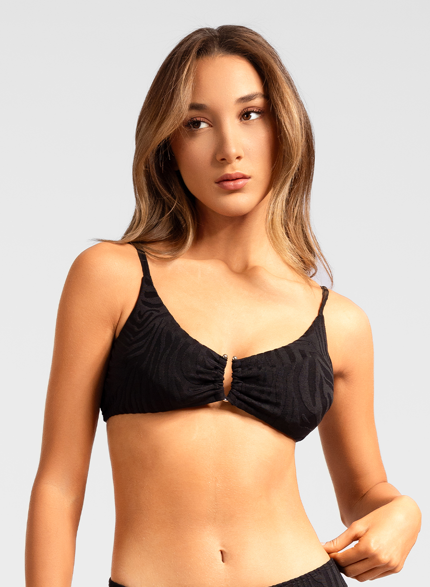 A sleek and stylish beachwear design featuring a bold black color with a chic ring accent at the front. The minimalist yet striking detail adds a touch of elegance to your beach look, perfect for making a statement by the water.
