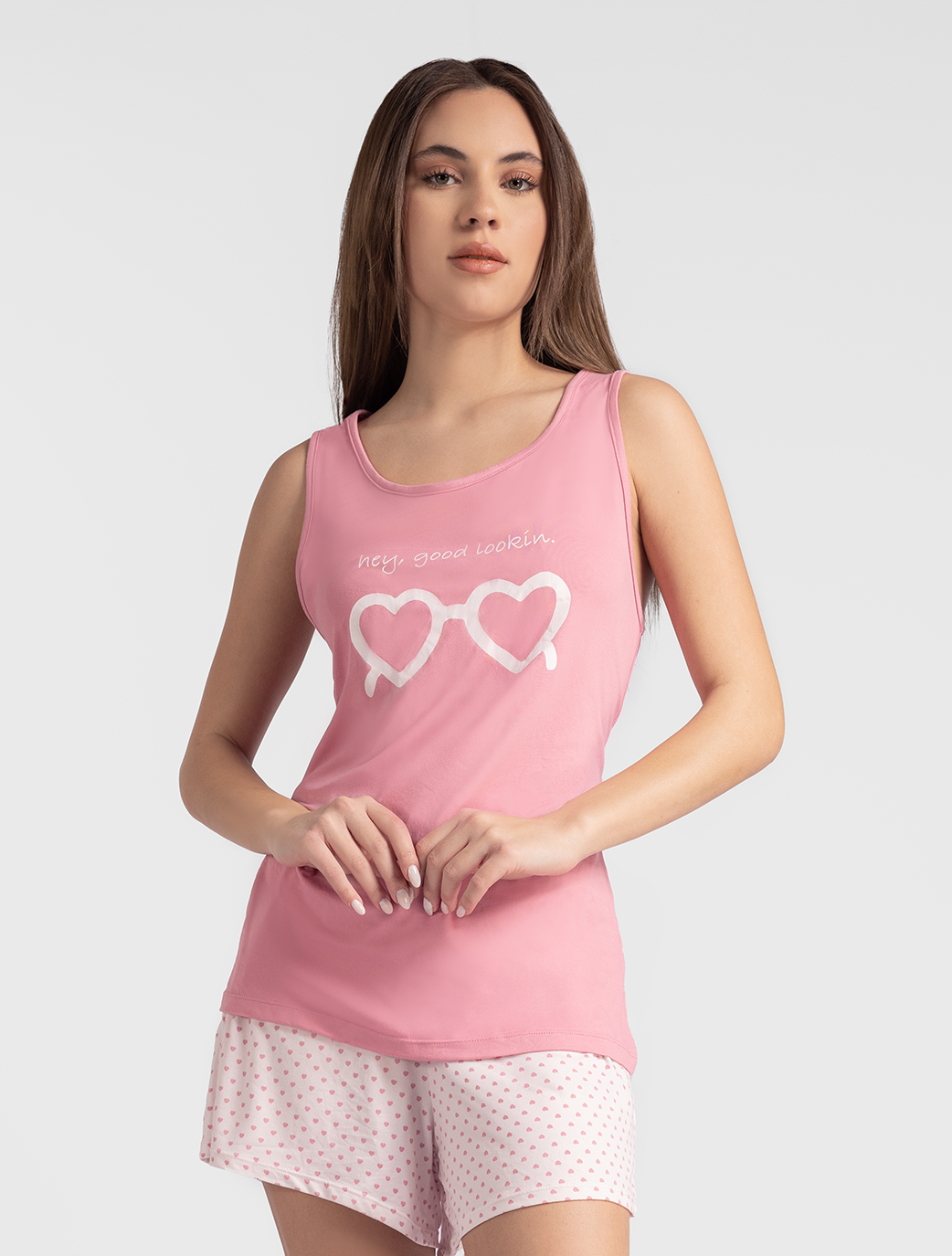 Tinaya I-Shirt is a charming nightwear piece in a soft pink color. It features a playful printed design of heart-shaped glasses, adding a touch of fun and whimsy to your bedtime look. Perfect for cozy nights, this shirt offers comfort and style, making it an ideal choice for relaxation.