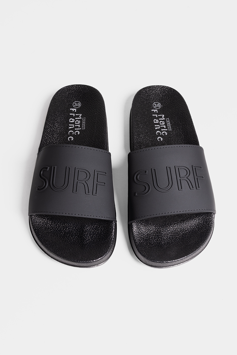 Waver Black Slider combines sleek minimalism with subtle boldness. Its smooth black finish is paired with a striking quote, "Fifth," engraved on the strap, adding a touch of personal flair. Perfect for casual wear, this slider effortlessly blends style and comfort, making it an essential addition to any wardrobe.