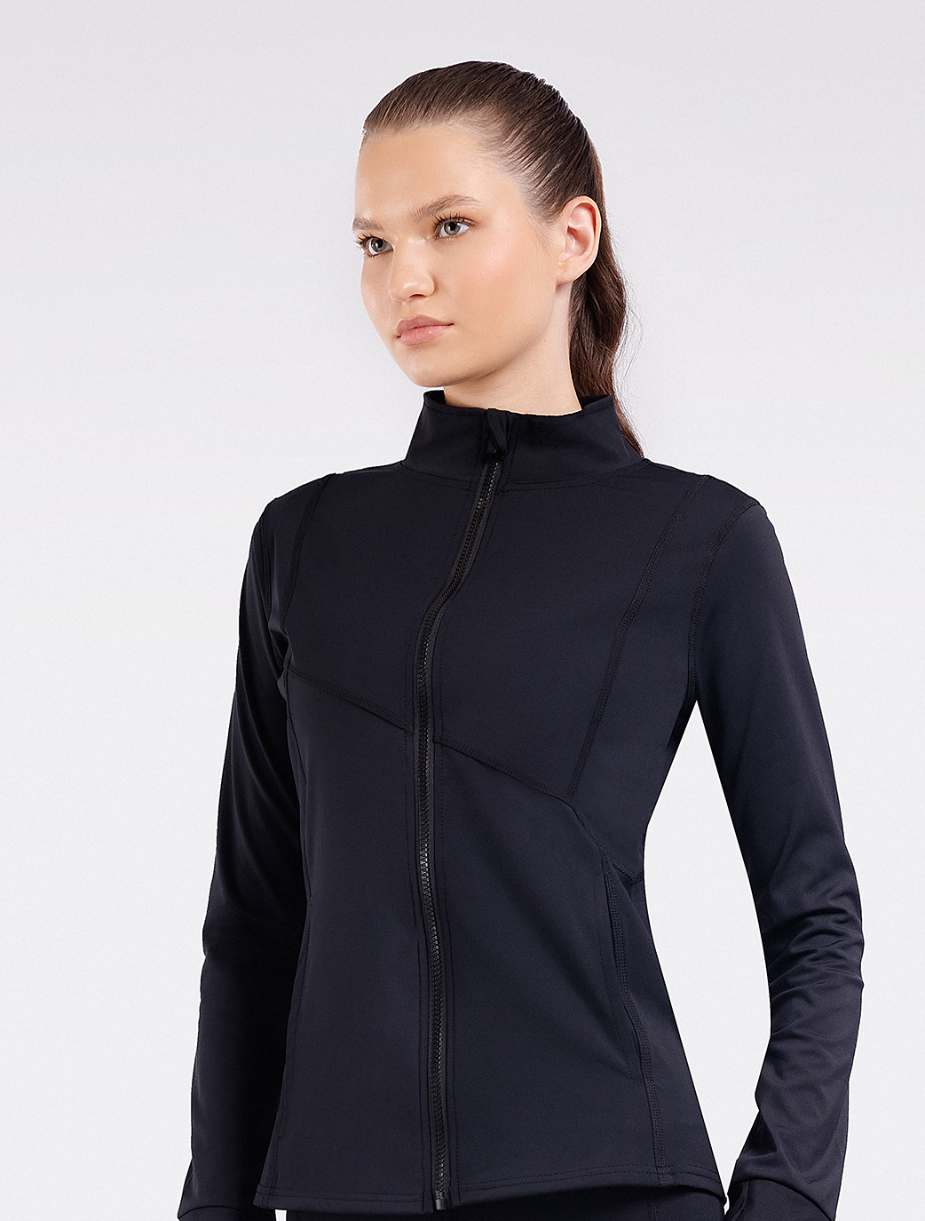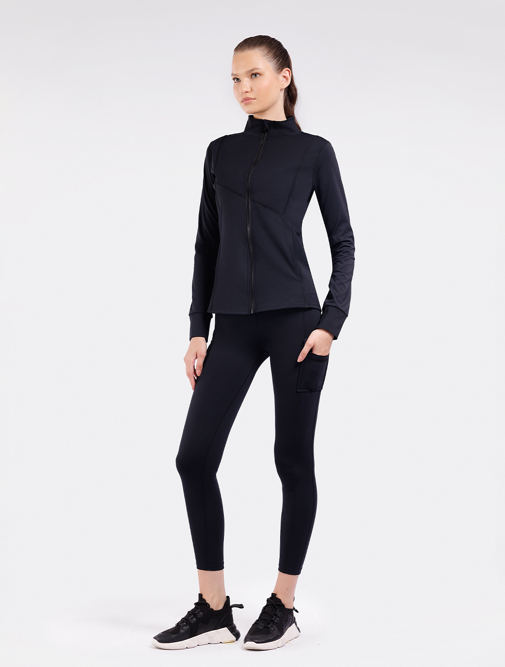 A long sportswear jacket with a zipper offers practicality and style in one sleek package. Ideal for cool weather, it provides extra coverage and can be easily adjusted for comfort.